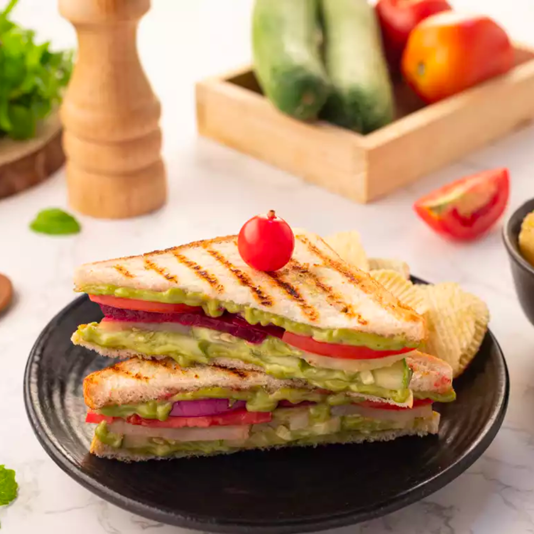A symphony of flavours in each layer of but- tery bread, fresh veggies, creamy cheese. All tucked into a satisfying bite!